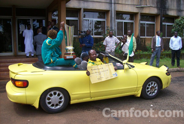 C’est à bord d’une décapotable jaune que le trophée de la coupe du Cameroun a traversé l’axe principal de la ville de Bafoussam avant de se retrouver chez le gouverneur, Pascal Mani, qui attendait en compagnie de ses proches collaborateurs. Le capitaine Tchoumté, par ailleurs gardien de but de Nzuimanto, qui portait le trophée, et Mefiré Woukoué, le meilleur joueur de cette finale y avaient pris place.
