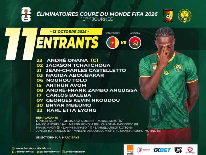 En attaque , Georges Kévin N’koudou est titulaire. Il profite de l’absence de Moumi Ngamaleu blessé. Bryan Mbeumo est dans le onze. Il avait réussi son entrée face à l’île Maurice mercredi dernier. André Onana est le capitaine des troupes.