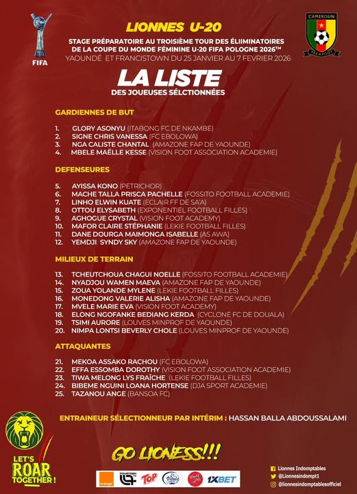 Le sélectionneur des Lionnes U20, Hassan Balla, a convoqué 25 joueuses. C’est dans le cadre du stage préparatoire du troisième tour des éliminatoires de la Coupe du monde féminine Pologne 2026. Ce regroupement ira du 25 janvier au 7 février. En effet, elles ont eu droit à deux séances d’entrainement ce mardi 27 janvier. Soit une séance au stade militaire et l’autre au centre technique de la Fécafoot où elles sont installées.