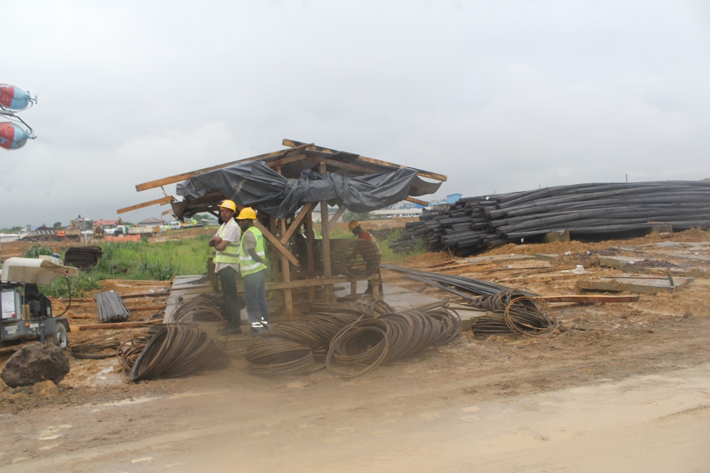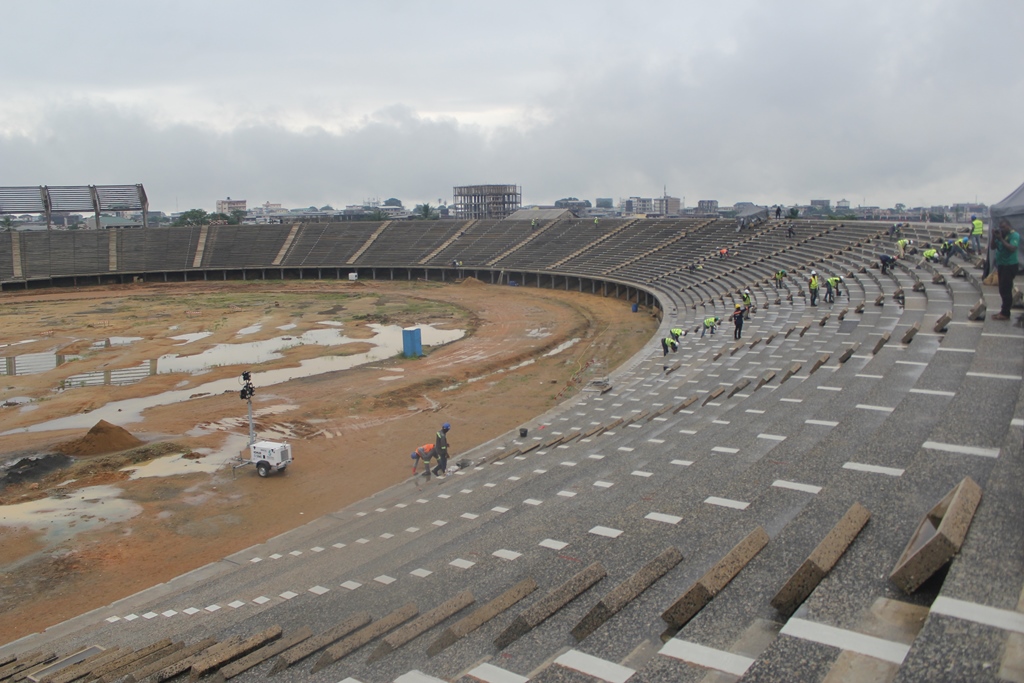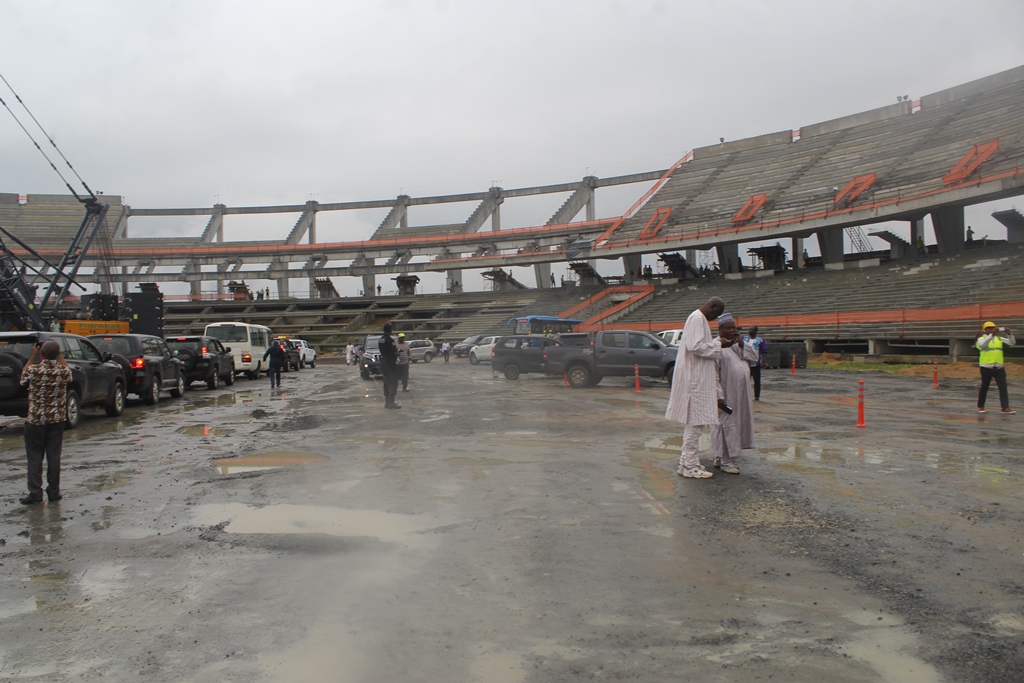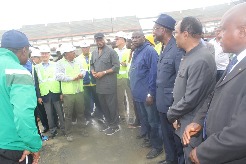Lors de la visite du chantier du Stade de Japoma, le Premier Ministre va se rendre compte que les contours des gradins ont déjà été dessiné. Les travaux de la pose de la toiture ont démarré.