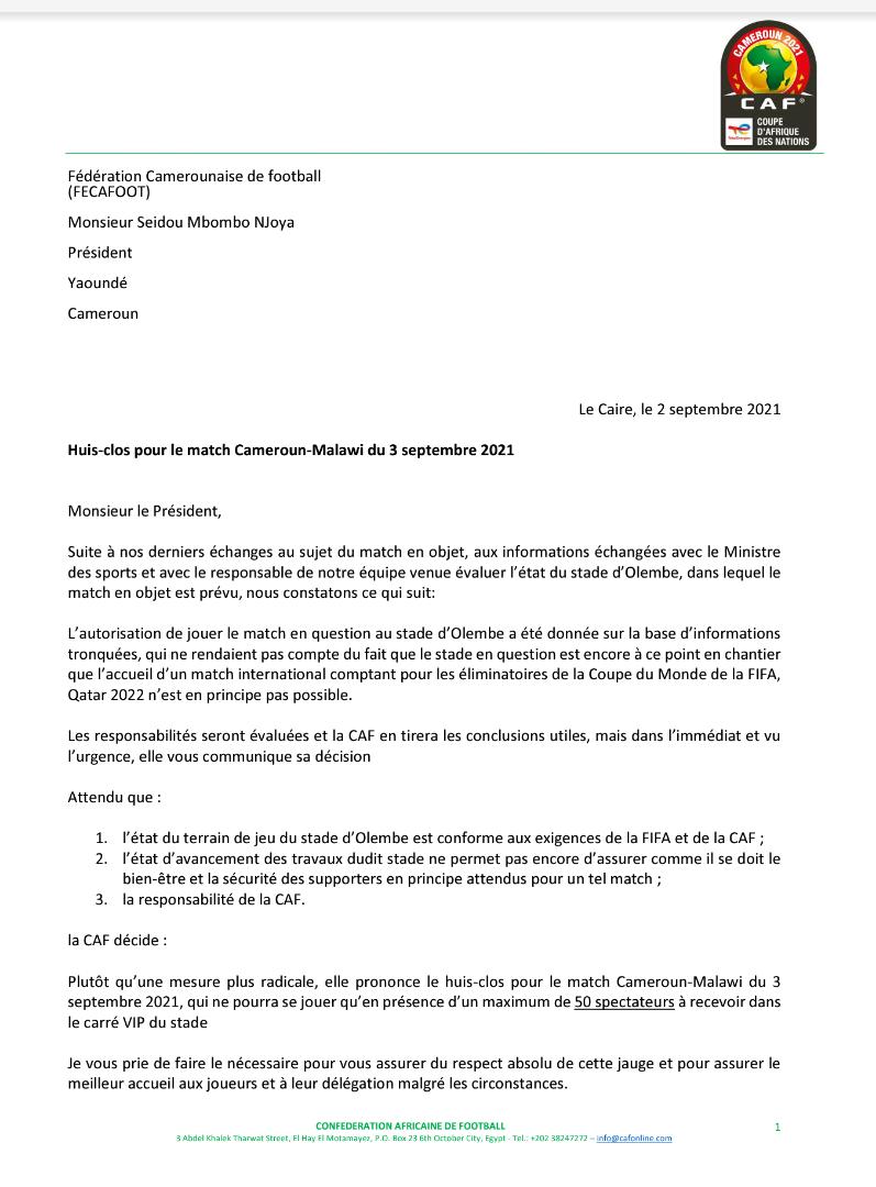 La Fecafoot a menti lorsqu’elle a présenté le huis clos du match entre le Cameroun et le Malawi comme étant causé par les protocoles COVID-19. Seidou Mbombo Njoya avait mal estimé les conséquences de cet autre gros mensonge. Et c’est le courrier du Secrétaire Général de la CAF, Veron Mosengo Omba, qui nous éclaire sur les vraies raisons de l’impossibilité de recevoir les spectateurs et des professionnels des médias. Lorsque la CAF décide que ce premier match des éliminatoires va se jouer au Stade Paul Biya, elle le fait sur la base « d’informations tronquées ».