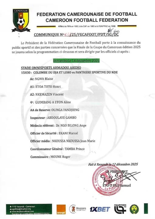 Colombe Sportive du Dja et Lobo affronte Panthère Sportive du Ndé ce dimanche. Ce sera pour le compte de la finale de la Coupe du Cameroun 2025. Cette rencontre va marquer la fin de la saison sportive 2024-2025. Pour diriger cette rencontre très attendue, on aurait pu croire que c’est le très talentueux Ndanga Ndinga qui soit au sifflet pour le remercier pour l’ensemble de son oeuvre. Helàs. La Fécafoot a confié le sifflet à Ngwa Blaise. C’est un arbitre connu pour son autorité lors des rencontres.