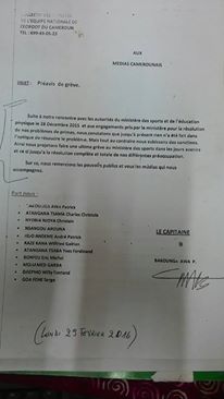 « Suite à notre rencontre avec les autorités du ministère des sports et de l’éducation physique le 28 décembre 2015 et aux engagements pris par le ministère pour la résolution de nos problèmes de primes, nous constatons que jusqu’à présent rien n’a été fait dans l’optique de résoudre le problème. Mais tout au contraire nous subissons des sanctions. Ainsi, nous projetons faire une ultime grève au ministère des sports le lundi 29 février 2016 et ceci jusqu’à la résolution complète et totale de nos différentes préoccupations », écrivent les signataires représentés par le capitaine de l’équipe nationale Patrick Bakounga Awa. Pour comprendre les contours de cette affaire, il faut parcourir la lettre de ces footballeurs courroucés adressée à Oumaro Tado, l’actuel secrétaire général du Minsep, Directeur des Sports de haut niveau à l’époque des faits. Dans cette correspondance dont Camfoot a eu copie, l’on apprend qu’il faut remonter jusqu’au lendemain de la Coupe d’Afrique des nations de Cecifoot disputée à Douala du 16 au 26 octobre 2015. Il avait été question, après plusieurs conciliabules dont la dernière en date du 28 décembre 2015 présidée par Tado, du « dénouement absolu de ce dossier au début de l’exercice de l’année budgétaire 2016 (fin janvier début février) ».