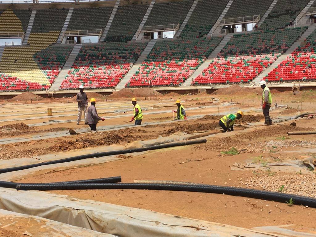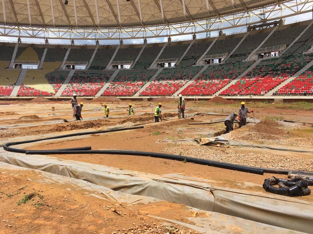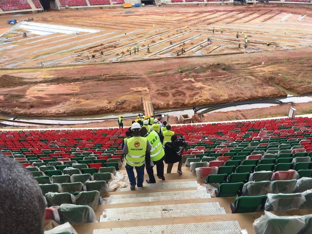Las d’attendre la reprise des travaux arrêtés depuis le mois de mars 2019, le Président du Comité d’Organisation de la Coupe d’Afrique des Nations 2021 a servi une mise en demeure bien sentie à l’entreprise italienne Gruppo Piccini pour la forcer à reprendre les travaux avant le 15 octobre 2019. Repondant donc à cet ultimatum adressé le 7 octobre dernier, les travaux, bien que timides, ont été réactivés sur deux fronts, l’habillage des façades et l’aménagement de l’aire de jeu.