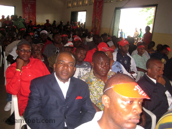 La ferveur et l’enthousiasme étaient perceptibles sur les visages. A l’entrée, des banderoles géantes annoncent l’événement depuis une semaine. Dans la cour de la salle fête, une entreprise brassicole, partenaire du mythique club d’Akwa, vend de la bière sur fond de musique de…Petit-Pays, un chanteur très populaire au Cameroun. Des sonorités qui noient difficilement les bruits émanant des troncs d’arbre secs et du groupe de danse traditionnelle venu donner de la voix. A côté, le fameux Ngando Picket et son groupe étaient également présents. Derrière eux, des hôtesses vendent les gadgets du club dont les couleurs sont le rouge et le blanc. A l’intérieur, la salle est pleine à craquer, obligeant les retardataires à s’asseoir sur les chaises à l’extérieur.