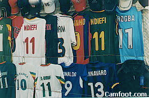 Côte de popularité 8,5/10Modeste MBAMIEn 2ème position MODESTE MBAMI est le lion qui en moins d’un an a su conquérir le public sénégalais. Très aimé et apprécié de tous, son passage à SEDAN où il était les coéquipiers de Moussa Ndiaye et Henri Camara des ténors de la sélection Sénégalaise, a fait de lui l’un des joueurs Camerounais les plus suivis et regardés au Sénégal. « Pentium » (comme on l’appelle à Paris) est un atout pour leurs rivaux camerounais. Cote de popularité 9/10Pius NDIEFFIEn 1ère position et ce à la surprise générale, – et c’est le bouquet des bouquets – PUIS NDIEFFI l’ex Sédanais ravi la vedette à tous les LIONS. Il a eu l’unanimité de tous les sondés. Ses maillots (localement faits bien sûr) sont sur toutes les étales des marchés Sénégalais (voir photo ci dessous) et sont vendus comme des petits pains. « Ndieffi » est le meilleur produit des Lions Indomptables au Sénégal. Hommes comme femmes ont un respect total pour sa personne. Ici on ne comprend toujours pas pourquoi il n’est pas titularisé au sein des LIONS. Certains nous avouaient tout cru: «on déteste les Lions Indomptables mais on aime Ndieffi» Cet amour que le public Sénégalais lui voue est inexplicable. Ici on lui trouve toutes les qualités du monde. Sa prestation en demi finale contre le Mali à Bamako et sa superbe Finale contre le Sénégal sont restées à jamais gravées dans les mémoires des Sénégalais. Si sa Majesté Ndieffi comme certains osent l’appelle ici venait à effectuer un voyage au Sénégal, il drainerait les mêmes foules d’admirateurs et sera traité au même titre qu’ El Hadj Diouf national. Côte de popularité 10/10Produits dérivésPhoto du SondageNB Nous noterons que par respect au très regreté Marco, nous n’avons pas voulu l’inclure dans ce sondage. Mais la majorité des sondés ont tenu avant ou après chaque entretien à nous souhaiter leurs condoléances, que Camfoot ne cessera de transmettre à sa famille.Sondage sur la Rue Ponty Sondage effectué par Louis ABONDO et son équipe de Dakar. abondo@camfoot.com