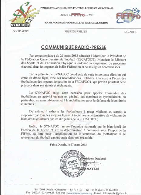 Nous vous laissons découvrir dans son intégralité le communiqué de presse, signé de David Mayebi, le président du Syndicat national des footballeurs du Cameroun (Synafoc), et vice-président à la Fécafoot, ce jeudi, 27 mars 2013.