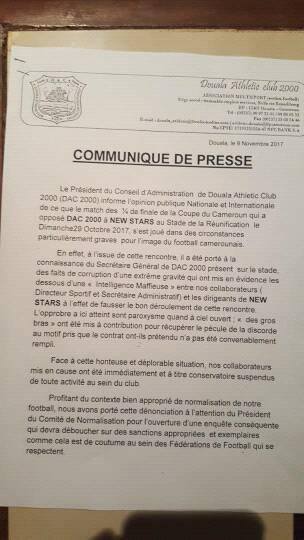 Le communiqué publié par le président du conseil d’administration de Douala Athletic club (Dac) 2000, Ngalè Nemangou, le 9 novembre dernier, a ébranlé le milieu du football camerounais. Dans cette note, le Pca de Dac 2000 informe le public que le directeur sportif et le secrétaire administratif ont été « suspendus à titre conservatoire de toute activité au sein du club ». Ils sont accusés par le club, d’avoir été corrompus par les dirigeants de New Stars de Douala, lors de la rencontre des quarts de finale de la Coupe du Cameroun (1-0), qui s’est déroulée, le dimanche 28 octobre 2017, au stade de la Réunification de Douala.
