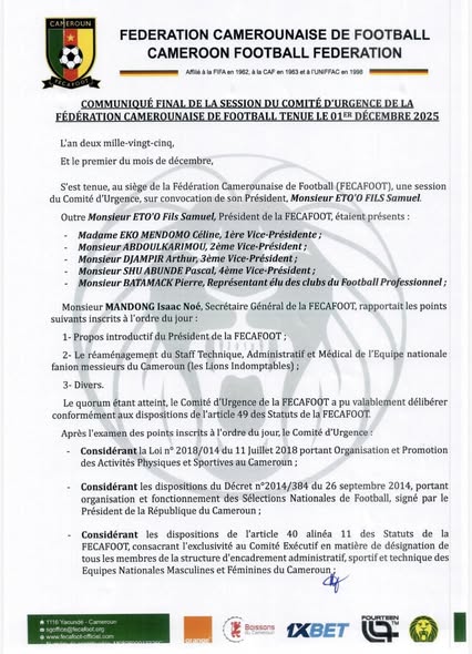 Ce limogeage de Marc Brys arrive au lendemain de l’Assemblée générale élective de la Fécafoot. Réélu pour un deuxième mandat à la tête de l’instance faîtière, Samuel Eto’o Fils avait annoncé les couleurs. Dans son discours, il indiquait qu’aucun joueur, encore moins aucun entraîneur ne sera au-dessus du Cameroun. Il avait déjà en ligne de mire ses cibles.