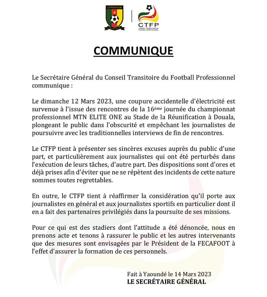 Le dimanche 12 Mars 2023, une coupure accidentelle d’électricité est survenue à l’issue des rencontres de la 16ème journée du championnat professionnel MTN ELITE ONE au Stade de la Réunification à Douala, plongeant le public dans l’obscurité et empêchant les journalistes de poursuivre avec les traditionnelles interviews de fin de rencontres.