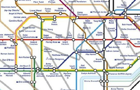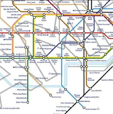 Autant dire que visionner ce plan de métro atypique équivaut à un voyage dans le temps, une balade dans l’univers de l’olympisme. Jesse Owens, Dick Fosbury (celui qui révolutionné le saut en hauteur), Carl Lewis, Aleksandr Popov, Michael Jordan, Cassius Clay (Muhammad Ali), Joe Frazier, Rafael Nadal, Roger Federer, Sergey Bubka, Michael Johnson, etc. toutes les légendes du sport sont là. La station Oxford Circus a été renommée « Ian Thorpe », champion australien de natation et l’arrêt de métro qui mène au stade olympique a été baptisée par le nom d’un autre nageur : l’Américain Michael Phelps, huit médailles d’or aux JO de Pékin de 2008.