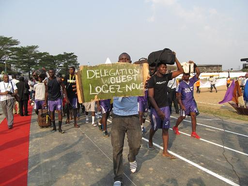 Les délégations ont profité du passage devant les autorités pour manifester leur mécontentement sujet au mauvais accueil qui leur a été réservé de leur arrivée dans les sites au démarrage des jeux. La délégation de l’ouest n’est pas passée par quatre chemins pour exprimer au chef de l’état son ras-le-bol. Cette expression des frustrations est motivée par le manque de logements. Il faut dire que certains nous ont confié avoir passés la nuit à la belle étoile. Sur des pancartes brandies, on peut lire : Logez-nous ! La délégation gabonaise délaissée et abandonnée a choisi de détourner leur regard des autorités à leur passage. Les jeunes de la région du Nord quant à eux ont revendiqué les repas.