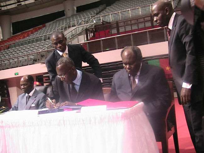 Jean Manga Onguené et ses adjoints Jean-Paul Akono, Etienne Sockeng et Robert Atah ont signé leurs contrats de travail ce lundi 6 septembre 2010. La cérémonie était présidée par le ministre des Sports et de l’éducation physique, qui a également procédé à l’installation des nouveaux responsables de son département ministériel, récemment nommés.