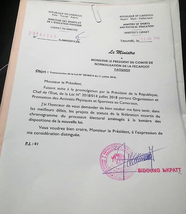 Au lendemain de la promulgation, par le Président de la République, de la Loi portant organisation et promotion des activités physiques et sportives, le ministre Bidoung Mpkwatt a fait parvenir au Président du Comité de Normalisation une note lui demandant de lui fournir une copie du projet de statut assortie du chronogramme du processus électoral aménagé qui tient compte des nouvelles exigences.