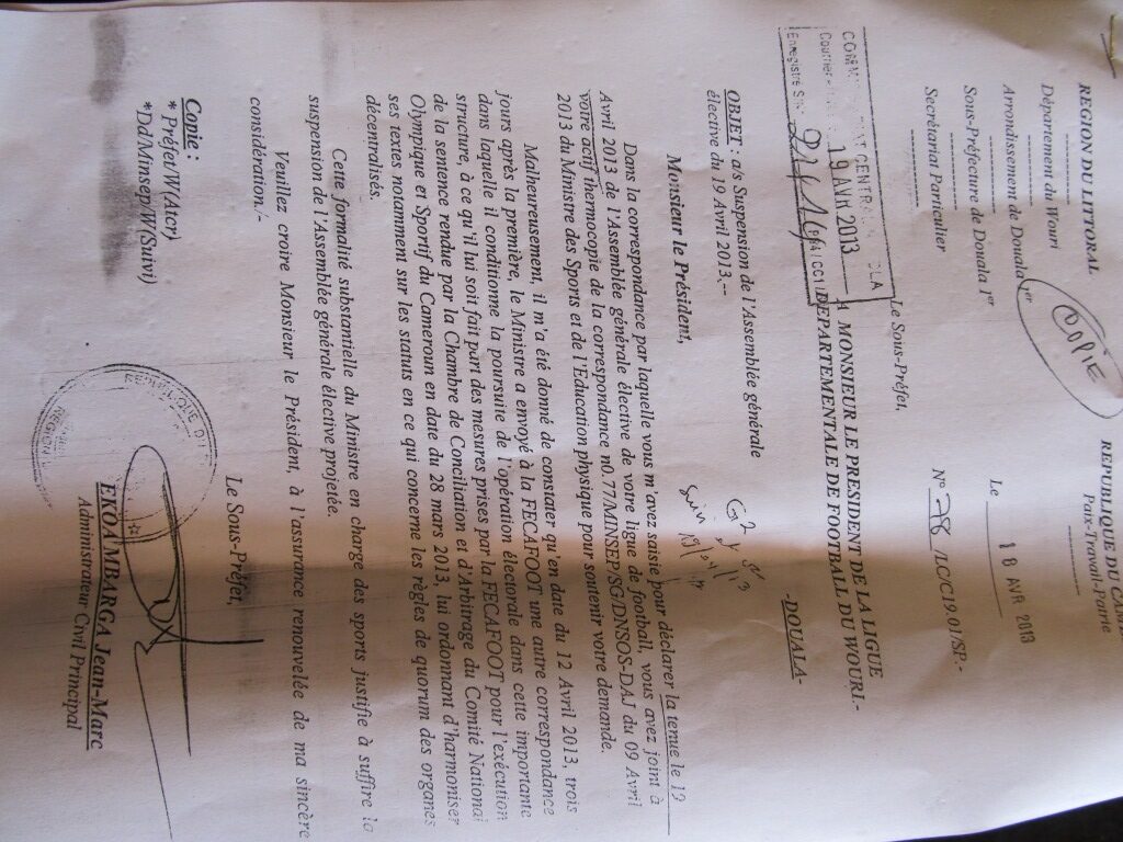 A la surprise du président de la ligue départementale du Wouri, Ekoa Mbarga, sous préfet de Douala 1er lui a adressé une correspondance au 18 avril soit un jour avant l’assemblée générale, annonçant la suspension de ladite assemblée générale. Cette décision du commis de l’Etat de surseoir le processus électoral comme exigé par le ministre des sports et de l’éducation physique, Adoum Garoua sera foulée au pied par le représentant de la fédération camerounaise de football (Fécafoot) dans le département du Wouri. Ce dernier a malgré tout réuni quelques présidents de clubs au lieu indiqué pour l’assemblée générale.