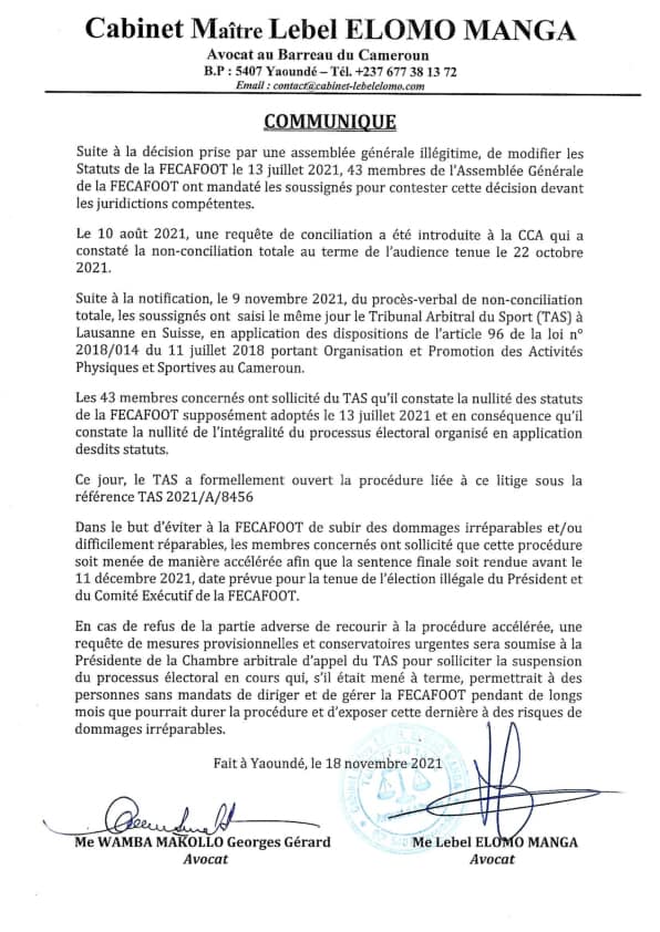 Abdouraman Hamadou est celui qui se dresse depuis plusieurs années pour combattre tout ce qui gangrène le football camerounais. Son groupe et lui ont eu plusieurs succès au Tribunal Arbitral du Sport dont la dernière a annulé en totalité les dernières élections à la Fécafoot. Il a communiqué su les réseaux sociaux et indique qu’à « la requête de 43 membres de l’Assemblée Générale de la FECAFOOT, le Tribunal Arbitral du Sport (TAS) a ouvert ce jour une procédure arbitrale concernant le faux processus électoral en cours à la FECAFOOT ».