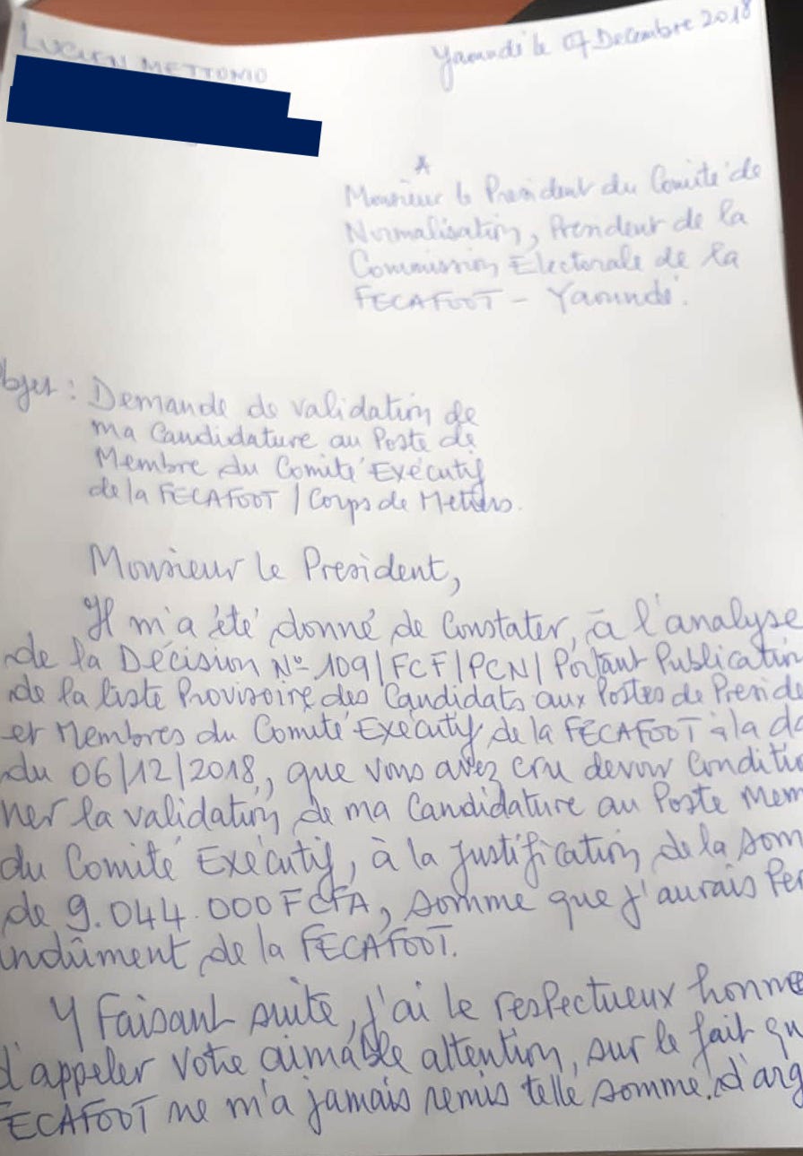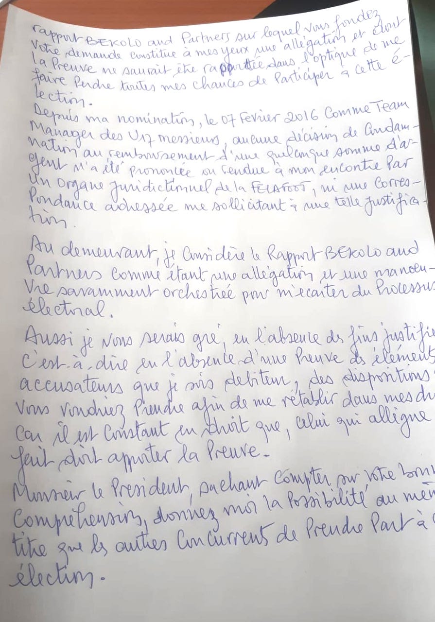 Nous avions déjà rapporté que le PCA de Union de Douala a dû batailler fort pour voir sa candidature validée, tout comme l’ancien Lion Indomptable Mabouang. Aux postes moins en vue tels que ceux du Comité Exécutif, on se serait attendu à une élection plus apaisée. Mais là aussi, Me Dieudonné Happi s’est battu pour invalider certaines candidatures dont celle de Lucien Mettomo.