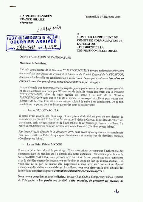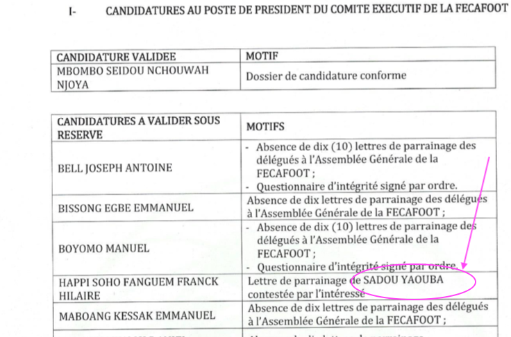 Dans sa circulaire numéro 108 PORTANT PUBLICATION DE LA LISTE PROVISOIRE DES CANDIDATS AUX POSTES DE PRESIDENT ET MEMBRES DU COMITE EXECUTIF DE LA FECAFOOT, Sadou Yaouba, membre de la région de l’extrême nord, accuse le candidat Happi d’avoir illégalement introduit une lettre de parrainage portant son nom.