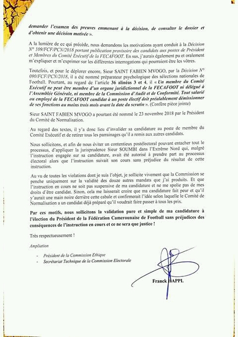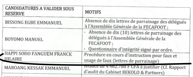 Et dans la circulaire numéro 109 PORTANT PUBLICATION DE LA LISTE PROVISOIRE DES CANDIDATS AUX POSTES DE PRESIDENT ET MEMBRES DU COMITE EXECUTIF DE LA FECAFOOT, on informe que la candidature de Franck Happi est en cours d’instruction pour faux et usage de faux (lettres de parrainage) sans indiquer de quelles lettres de parrainage, en dehors du premier cas, il s’agit.