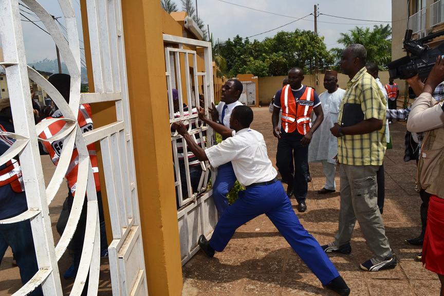 Le portail de la Fédération était déformé par des coups violents. Ici, des échauffourées ont eu lieu quelques minutes plus tôt, entre les agents de sécurité de la Fécafoot et des manifestants qui tendaient d’entrer dans l’enceinte de la Tour à l’effet d’interrompre l’assemblée générale élective de la Ligue régionale de football du Littoral qui s’y tenait. Pourtant, ladite assemblée ne devait pas avoir lieu, car interdite par le sous-préfet de l’arrondissement. « Nous avons saisi les responsables de cette assemblée, pour qu’ils se rapprochent d’abord de l’autorité pour solliciter une autorisation. Ce qui n’a pas été le cas », explique Mireille Noah Ossegue.