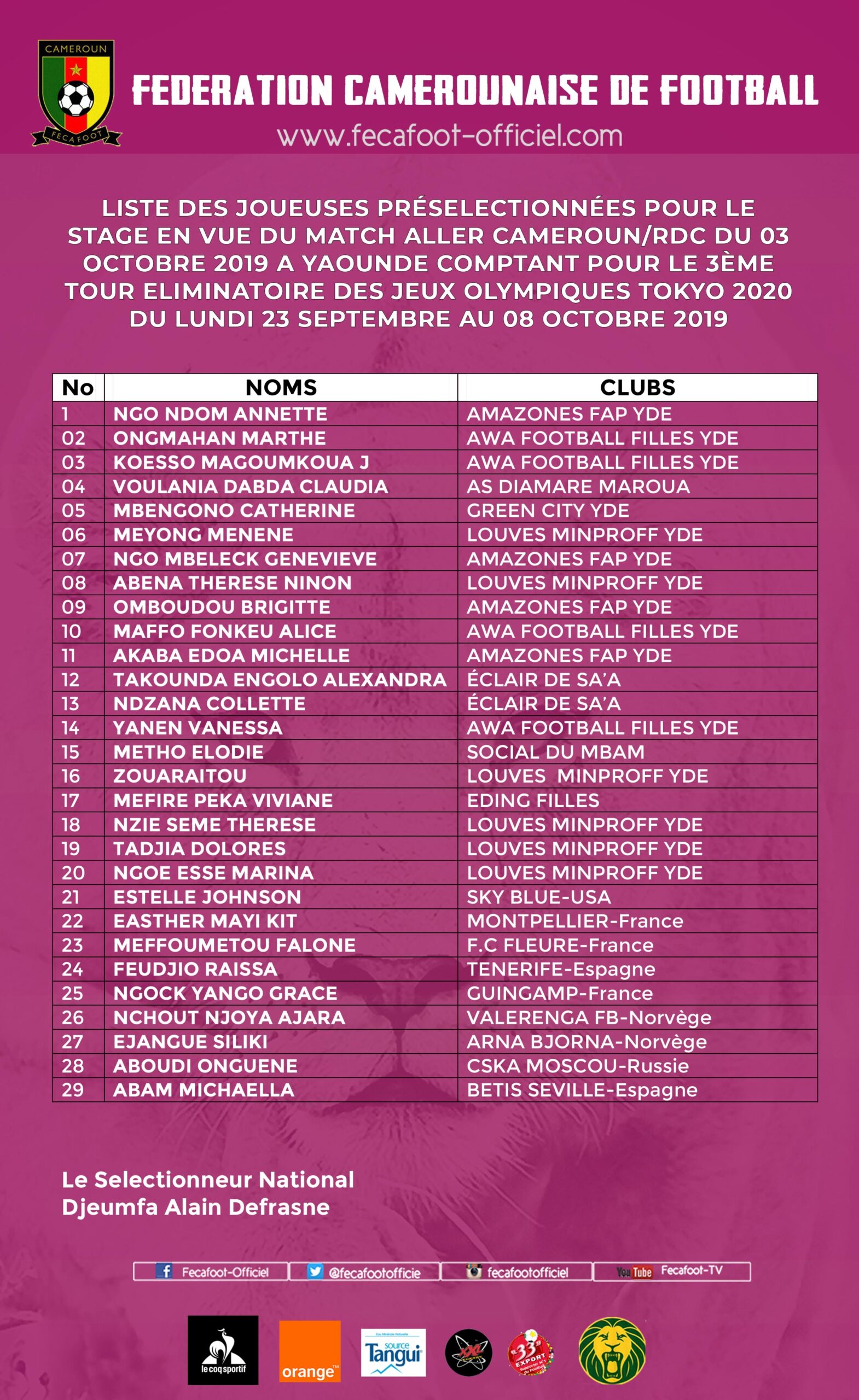Alain Djeumfa, le sélectionneur de l’équipe nationale des femmes a convoqué vingt neuf joueuses pour préparer le match du dernier tour éliminatoire des Jeux Olympiques 2020. Le match se jouera en aller et retour contre leurs homologues la République Démocratique du Congo. Le stage débutera ce lundi 23 septembre et ira jusqu’au 8 octobre. Si la quasi-totalité des joueuses retenues pour le dernier match contre l’Éthiopie a été rappelée, ce n’est pas le cas de Farida Machia.