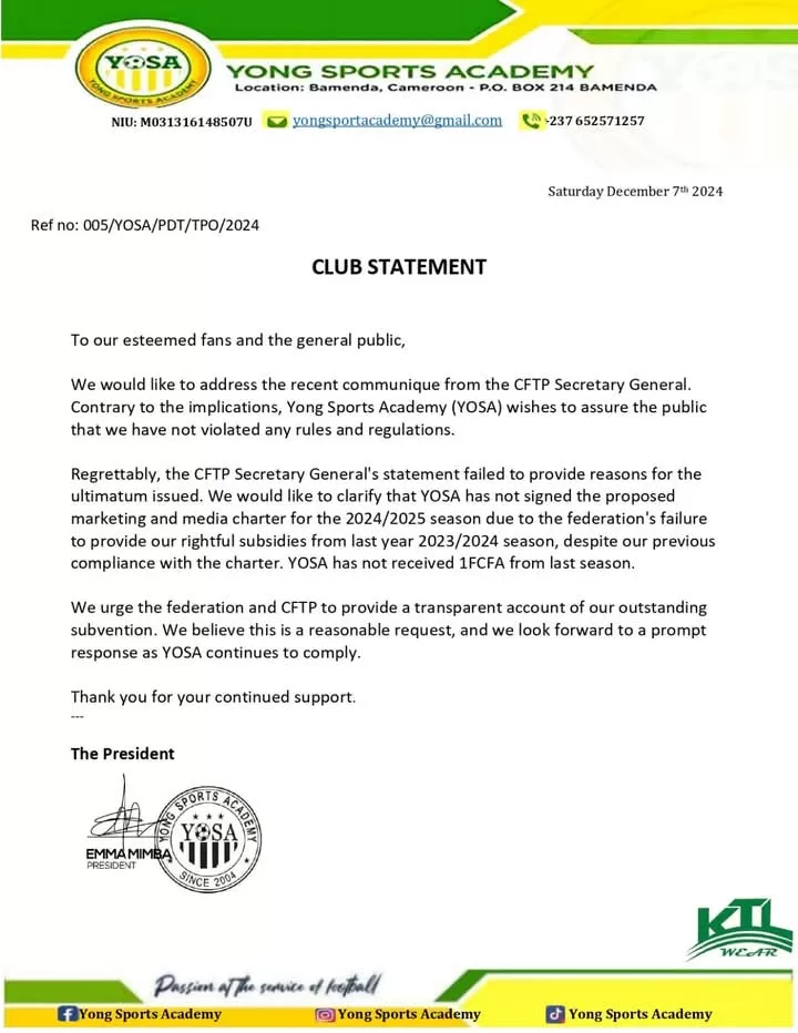 Comme on pouvait s’y attendre, le président de YOSA, Emma Mimba, est sorti de sa réserve. D’un ton calme, il a tenu à rassurer les supporters et le public. Selon lui, le club, contrairement à la sortie du CTFP, n’a violé aucune règle. Il appelle la FECAFOOT à la transparence des fonds. La charte marketing est au cœur de la ‘’discorde’’. Le président dit n’avoir rien reçu la saison dernière. Pourtant, il avait signé la charte de la saison dernière. Il veut y voir clair. Rappelons que YOSA devrait affronter Victoria United ce dimanche au Centenary stadium de Limbé.