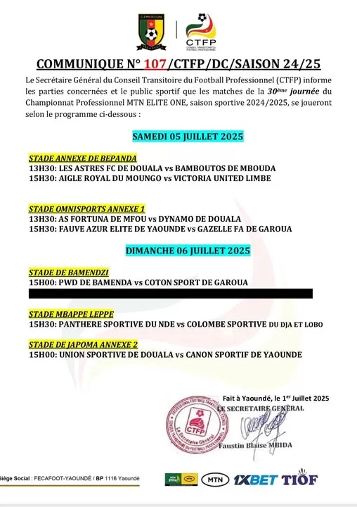 Dimanche au stade de Bamendzi, PWD de Bamenda va affronter Coton sport de Garoua. Au stade Mbappé Leppé, Panthère sportive du Ndé affronte Colombe sportive du Dja et Lobo. À l’annexe 2 de Japoma, Union sportive de Douala reçoit Canon sportif de Yaoundé.