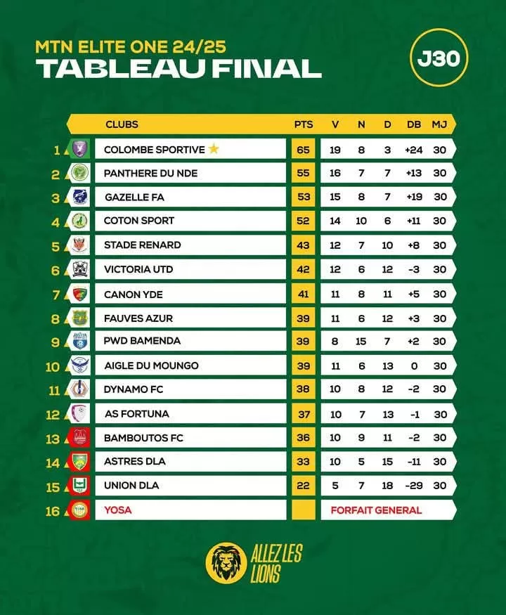 Colombe sportive du Dja et Lobo a reçu son trophée de champion du Cameroun. Malgré la défaite essuyée face à Panthère sportive du Dja (1-0), la fête était belle avec une ambiance infernale. En effet, le club de la région du Sud est resté constant malgré les turbulences. Avec seulement trois défaites concédées en 30 matchs, Richard Towa et les siens étaient de loin meilleurs. En chiffres, Colombe a remporté 19 matchs, 8 matchs nuls et 3 défaites. L’oiseau du Sud termine donc leader avec 65 points.