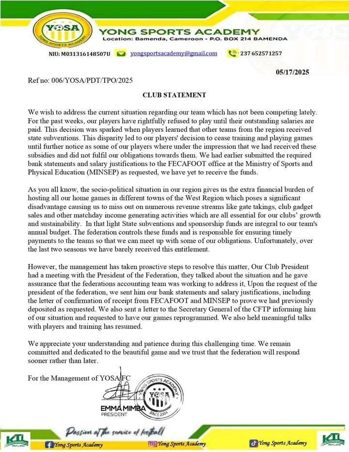 Nous souhaitons évoquer la situation actuelle de notre équipe, qui n’a pas participé aux deux dernières journées du championnat. Ces dernières semaines, nos joueurs ont, à juste titre, refusé de jouer tant que leurs salaires n’étaient pas payés. Cette décision a été prise après que les joueurs ont appris que d’autres équipes recevaient les subventions de l’État. Cette disparité a conduit nos joueurs à cesser l’entraînement et les matchs jusqu’à nouvel ordre. Certains d’entre eux pensant que nous avions perçu ces subventions et que nous n’avions pas rempli nos obligations envers eux. Nous avions auparavant soumis les relevés de compte et les justificatifs de salaire requis au bureau de la FECAFOOT au ministère des Sports et de l’Éducation physique (MINSEP), comme demandé. Mais, nous n’avons toujours pas reçu les fonds.