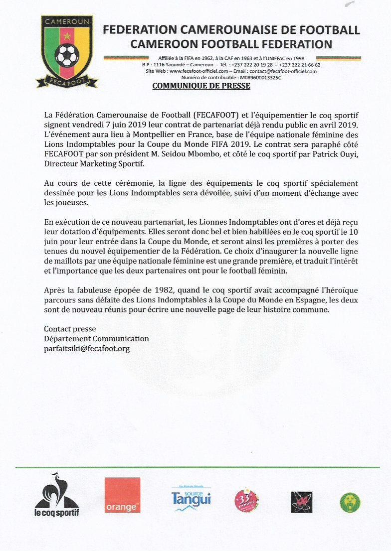 S’il avait été annoncé que le contrat qui lie la Fédération Camerounaise de Football au Coq Sportif allait prendre effet le 1er juin, ce sera finalement le 7 de ce même mois qu’aura lieu la signature du contrat. Habituellement, cela se faisait qu Cameroun, à Yaoundé pour être plus précis. Mais l’entente sera signée cette fois à Montpellier en France, base de l’équipe féminine du Cameroun, Les Lionnes indomptables, durant la Coupe du Monde FIFA 2019.
