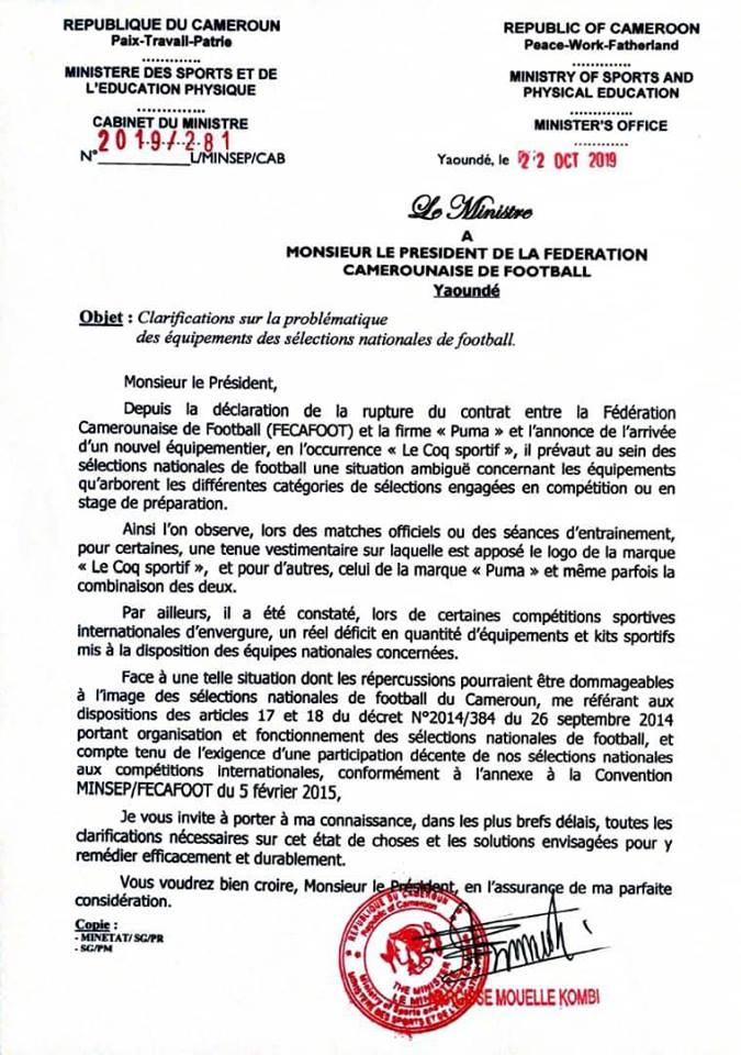 Le Ministre des Sports et de l’Éducation Physique, soucieux que l’image de marque du Cameroun ne tombe plus bas que les abymes où elle réside en ce moment, souhaite recevoir dans les plus brefs délais, des explications de la Fécafoot.