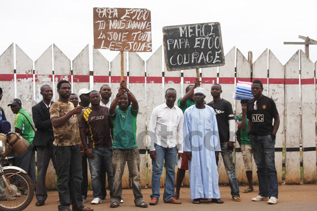 «Merci papa Eto’o, courage», «papa Eto’o, tu nous donnes la joie tous les jours», ou «papa Eto’o, l’homme de la réconciliation et de la paix»…, les messages écrits sur des pancartes et brandis étaient très nombreux. Un groupe de danseurs de tambours et de balafons étaient également présent.