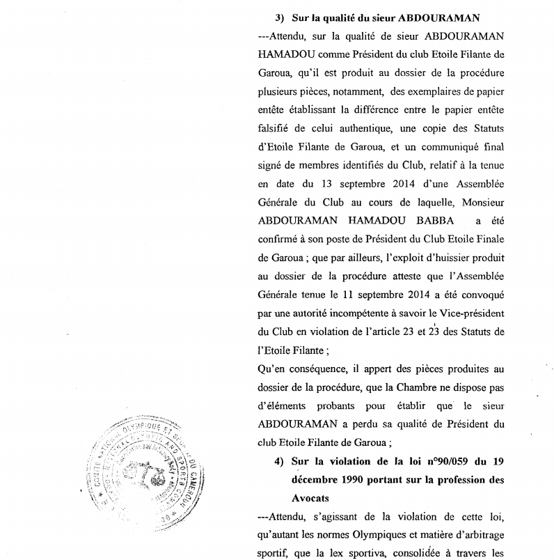 —Attendu, sur la qualité de sieur Abdouraman Hamadou comme président du club Etoile Filante de Garoua qu’il est produit au dossier de la procédure plusieurs pièces, notamment, des exemplaires de papier entête établissant la différence entre le papier entête falsifié de celui authentique, une copie des Statuts d’Etoile Filante de Garoua et un communiqué final signé de membres identifiés du Club, relatif à la tenue en date du 13 septembre 2014 d’une Assemblée Générale du Club au cours de laquelle, Monsieur Abdouraman Hamadou Babba a été confirmé à son poste de Président du Club Etoile Finale de Garoua ;