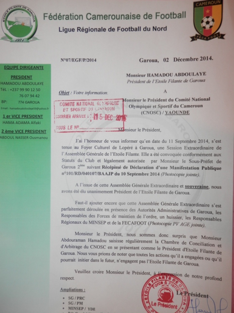 Suite au recours introduit par Abdouraman Hamadou auprès de la Chambre de conciliation et d’arbitrage (Cca) du Comité national olympique et sportif du Cameroun (Cnosc) sur la non-légitimité de son élection à la présidence du club de l’Etoile Filante de Garoua, Hamadou Abdoulaye a tenu à clarifier la situation à travers une lettre adressée le 2 décembre au président de l’instance, Kalkaba Malboum.