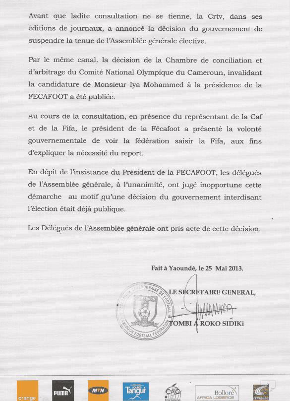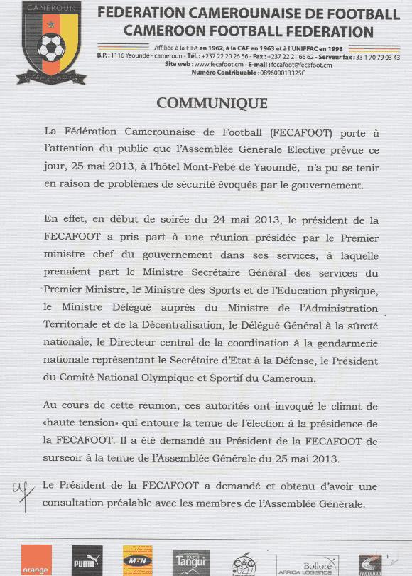 Prévue ce Samedi 25 Mai 2013, l’assemblée générale élective de la fédération camerounaise de football n’aura pas lieu. Le gouvernement évoque un problème de sécurité.
