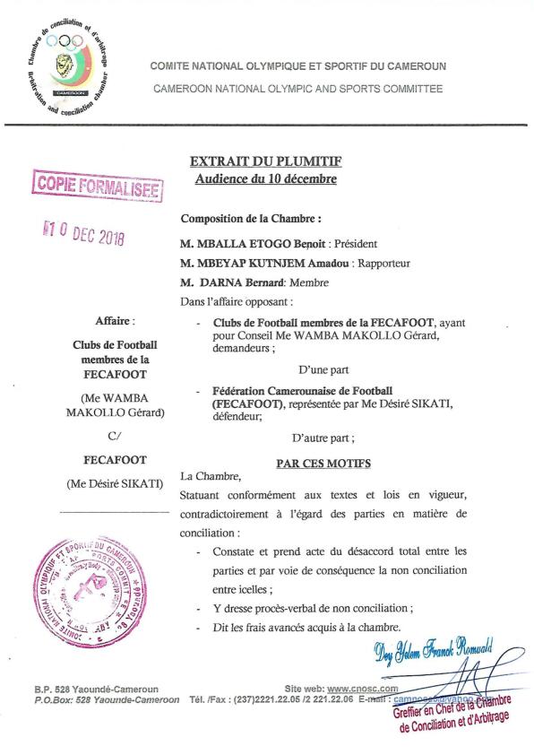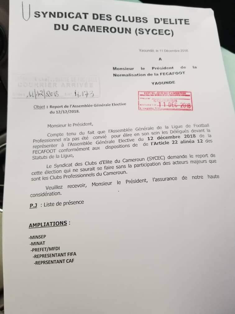 Le Syndicat des Clubs d’Élite du Cameroun, après avoir demandé et essuyé un refus de la part de la Fédération Camerounaise de Football représenté par le Comité de Normalisation de reporter l’assemblée élective de l’instance, a porté sa cause devant la chambre de litiges du Comité National Olympique et Sportif du Cameroun. C’est que les quatorze délégués de la Ligue n’auraient pas été invité à prendre part aux élections. Et ils ne sont pas les seuls puisque les ligues spécialisées ont aussi été exclu. C’est un peu plus de 20% des délégués votants qui n’exerceront pas leurs prérogatives.