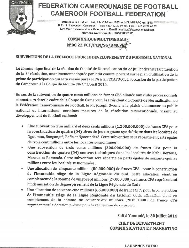 A travers un communiqué de presse signe mercredi par la responsable du département communication et marketing de la Fédération camerounaise de football (Fécafoot), Laurence Fotso, le président du Comité de normalisation de l’instance, Joseph Owona informe « le public national et international » des dispositions relatives à la redistribution de « la prime de participation » qui sera versée par la Fédération internationale de football association (Fifa) à la Fécafoot, à l’occasion de la participation de la sélection fanion de football du Cameron à la Coupe du monde de Brésil 2014. L’intégralité du communiqué.