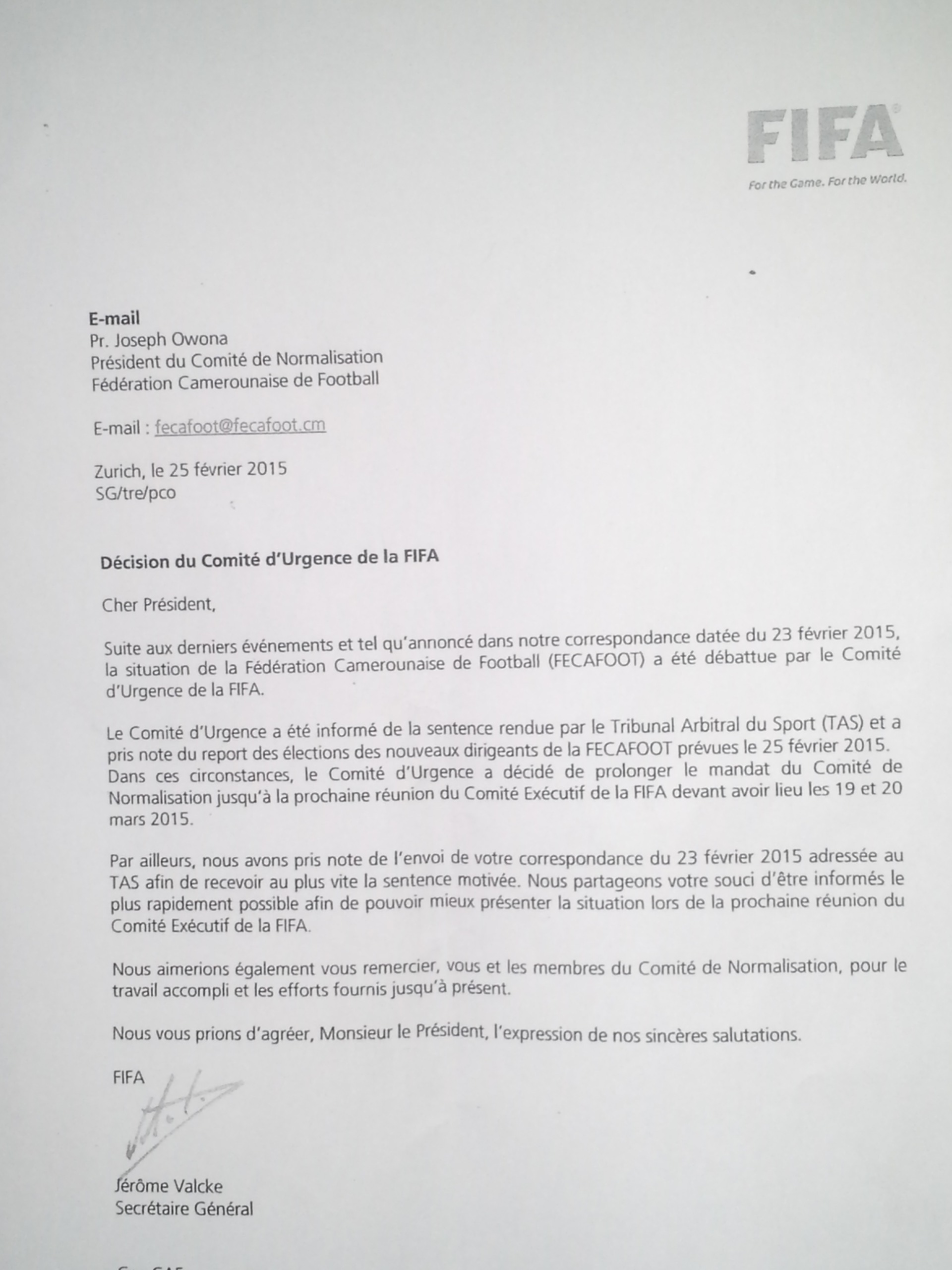 C’est en effet à cette date, ou bien avant, que le Comité exécutif de la Fifa décidera d’une suite à donner dans ce long feuilleton, dont le dernier rebondissement fait suite à une décision du Tribunal Arbitral du Sport (TAS), entérinant le verdict de la Chambre de conciliation et d’arbitrage du Comité national olympique et sportif du Cameroun, annulant les résolutions de l’Assemblée générale du 23 août 2014.