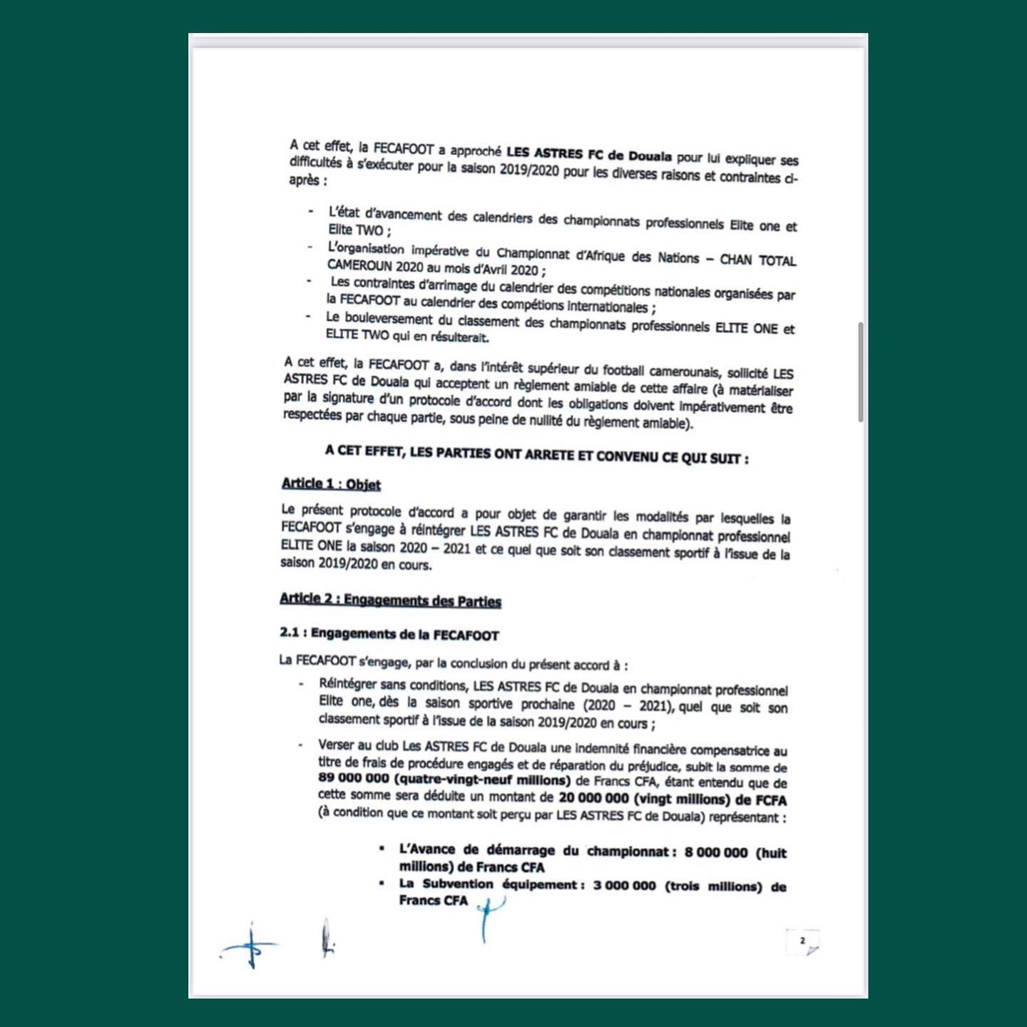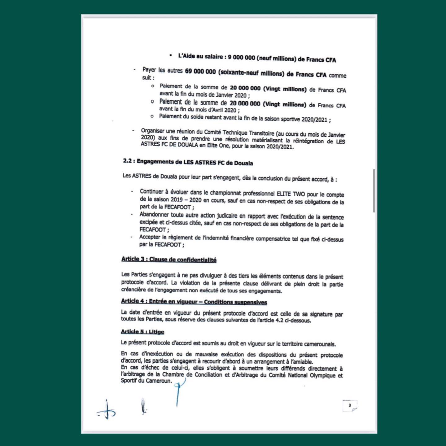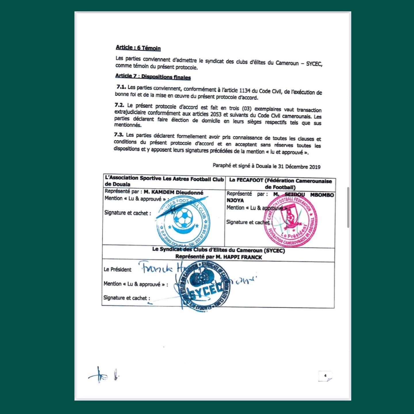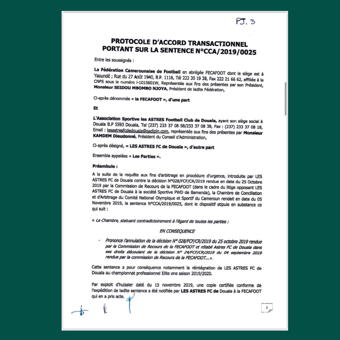 En effet, en date du 31 décembre 2019 s’est tenue une réunion à Douala entre Sieurs Mbombo Seidou Nchouwa Njoya (Président par intérim de la Fécafoot), Aboubakar Alim Konate (1er Vice-Président par intérim de la Fécafoot et par ailleurs Président du Comité Technique Transitoire an moment des faits), Kamdem Dieudonné (Représentant l’Association Sportive des Astres) et Franck Happi (Représentant le Syndicat des Clubs d’Elites du Cameroun) ayant abouti à un Protocol d’Accord Transactionnel portant sur la sentence N°CCA/2019/0025 visé et signé par toutes les parties prenantes (pièce jointe 3).