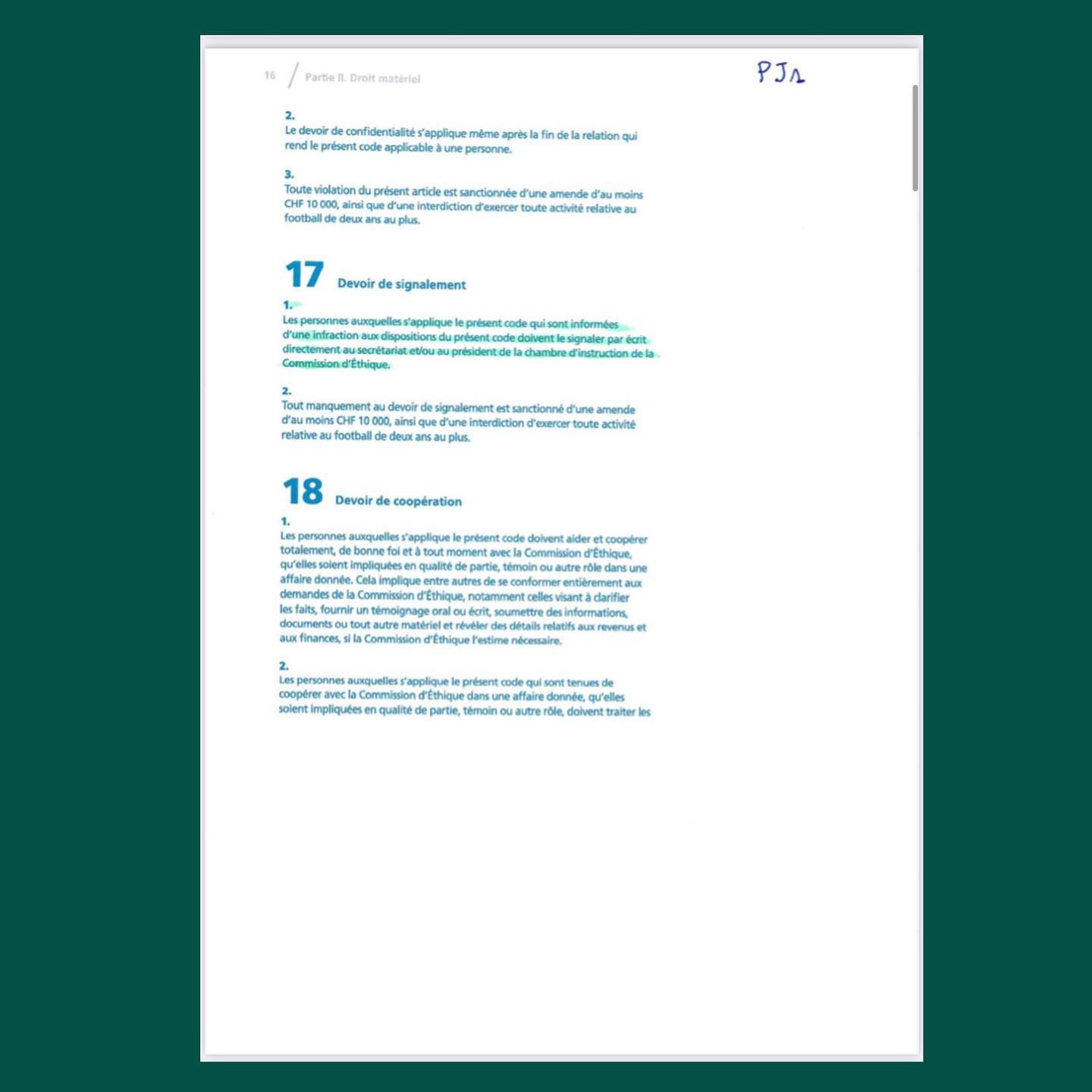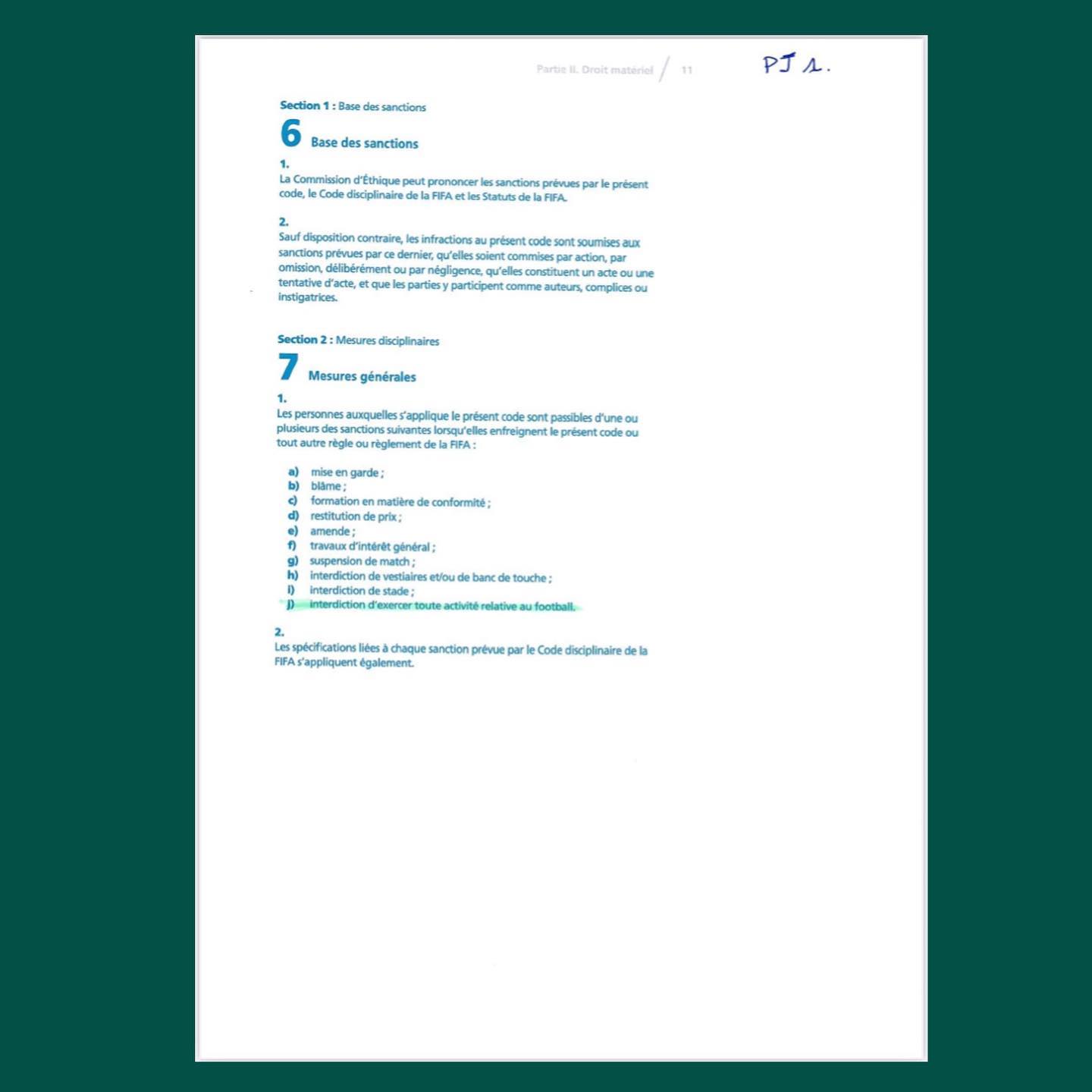 Monsieur le Président, la signature d’un tel acte est l’illustration parfaite du CANCER MONDIAL du FOOTBALL, car non seulement il corrompt les signataires, il incite aux trucages des résultats des matchs et enfin il ouvre une porte sur des détournements de fonds de l’association sportive concernée, tel que décrié dans les articles 27, 28 et 29 du Code d’Éthique de la FIFA (pièce jointe 4) ainsi que des articles 21, 25, 28 et 29 du Code d’Ethique de la FECAFOOT (pièce jointe 5). Il est inutile de souligner que le club les Astres FC de Douala a fini premier de la saison sportive 2019/2020.