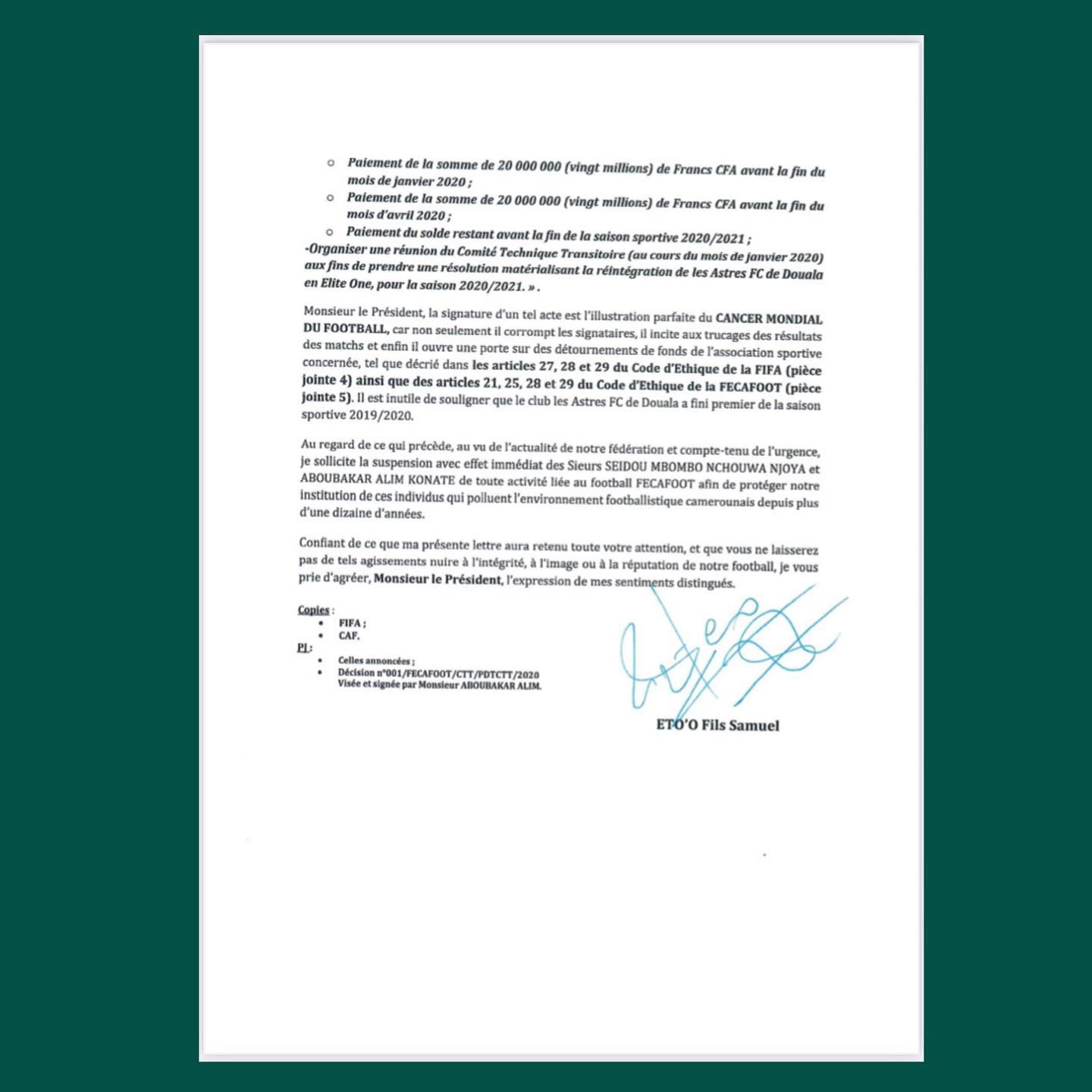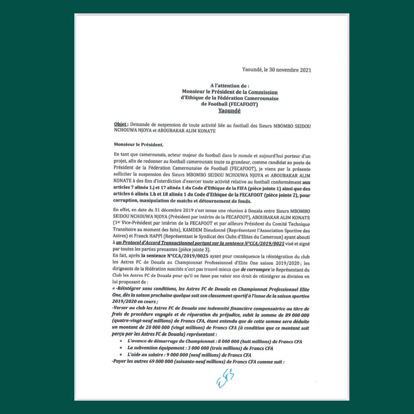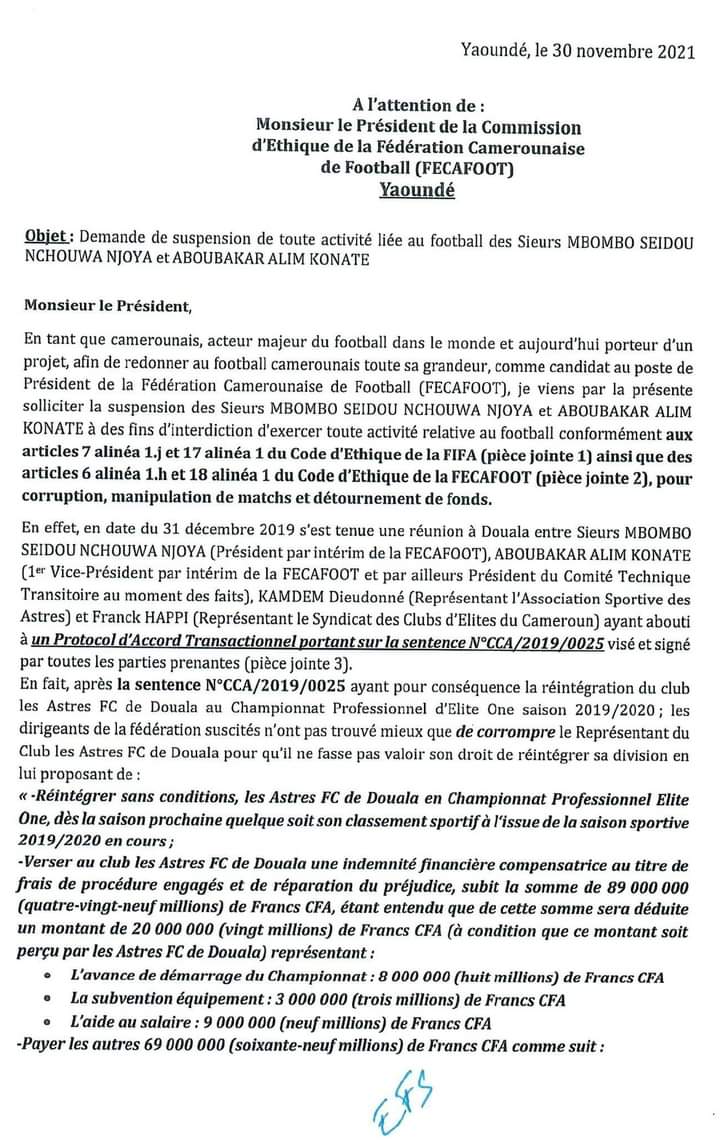 En tant que camerounais, acteur majeur du football dans le monde et aujourd’hui porteur d’un projet, afin de redonner au football camerounais toute sa grandeur, comme candidat au poste de Président de la Fédération Camerounaise de Football (FECAFOOT), je viens par la présente solliciter la suspension des Sieurs Mbombo Seidou Nchouwa Njoya et Aboubakar Alim Konate à des fins d’interdiction d’exercer toute activité relative au football conformément aux articles 7 alinéa 1.) et 17 alinéa 1 du Code d’Ethique de la FIFA (pièce jointe 1) ainsi que des articles 6 alinéa 1.h 01 18 alinéa 1 du Code d’Ethique de la FECAFOOT (pièce jointe 2), pour corruption, manipulation de matchs et détournement de fonds.