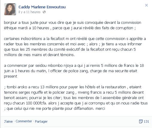 Accusatrice et accusée dans une rocambolesque histoire de corruption préélectorale à la fédération camerounaise de football, Caddy Marlène Emvoutou enfonce le clou. Sur sa page Facebook, la malheureuse candidate des dernières élections à la tête de la Fécafoot contre-attaque et donne des noms.