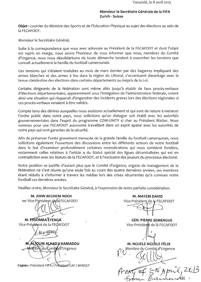 Dans une correspondance signée conjointement par John Begheni Ndeh, David Mayebi, Essomba Eyenga, Pierre Semengue, Alioum Aladji Hamadou et Nguele Nguele Félix, le comité d’urgence de la fédération camerounaise de football a écrit à la FIFA. L’intégralité de la lettre.