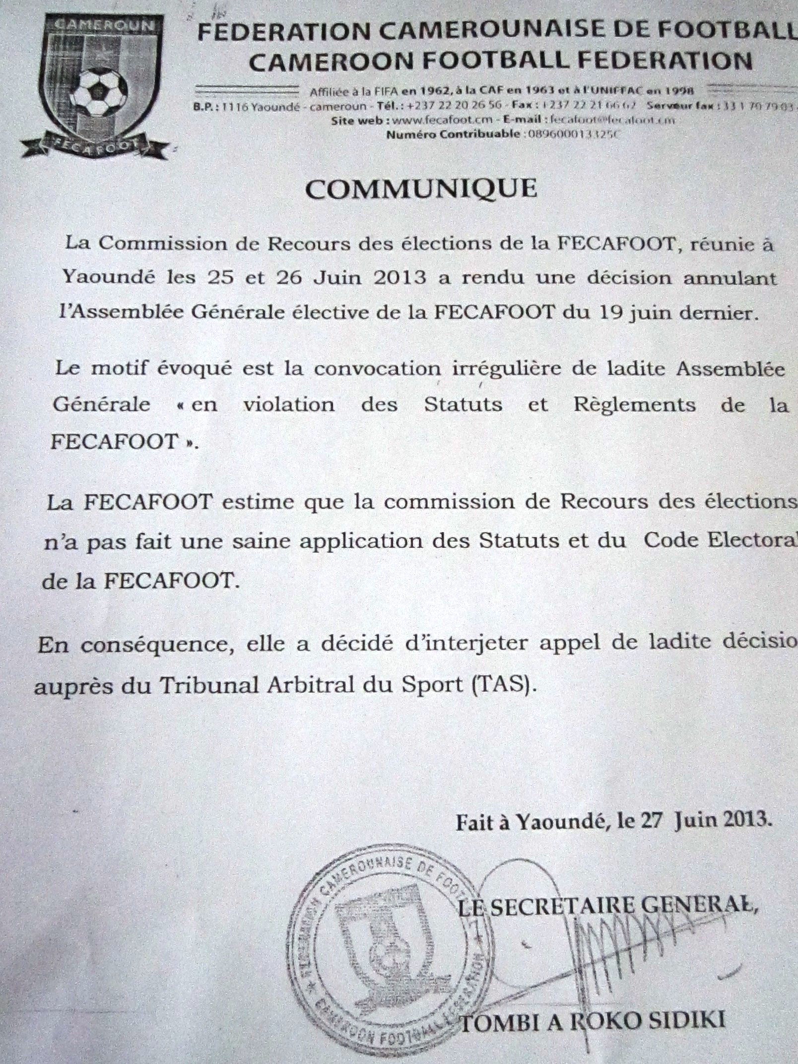 Suite à l’annulation hier de l’élection du 19 juin dernier par la Commission de recours des élections de la Fédération camerounaise de football, les membres du Comité exécutif élus à ce scrutin ont décidé d’interjeter appel auprès du Tribunal arbitral du Sport.