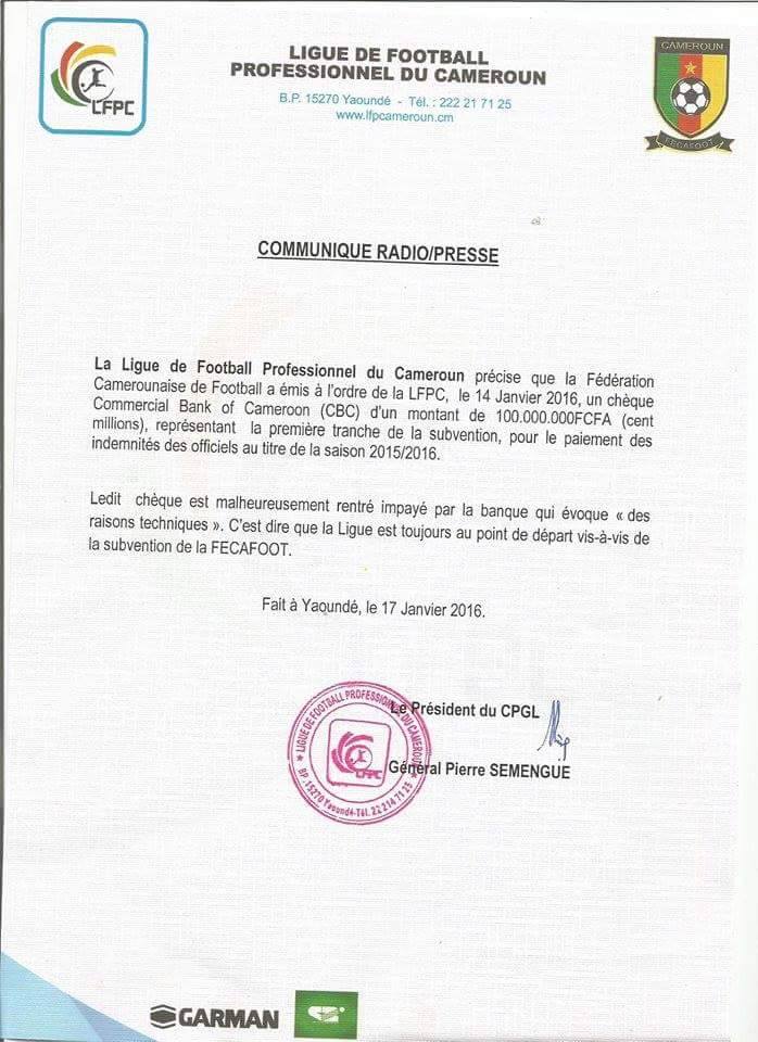 Un communiqué qui a laissé croire selon certains médias, que la Fécafoot n’a pas d’argent et que c’est cela qui justifie le double report de la saison. Ainsi, c’est aussi à travers un communiqué signé ce lundi, que le secrétaire général adjoint de la Fécafoot a voulu éclairer la situation, et recadrer le Général Pierre Semengue. Selon Patrick Ebodé Tsanga, des renseignements recueillis auprès des banques, il ressort que cette situation est due aux « nouveaux règlements de la COBAC suivant lesquels les paiements d’un montant égal ou supérieur à 100 000 000 (cent millions) Fcfa ne peuvent plus être effectués par chèque, mais uniquement par virement. Ces règlements n’ont pas encore été notifiés à la Fédération », explique-t-il.