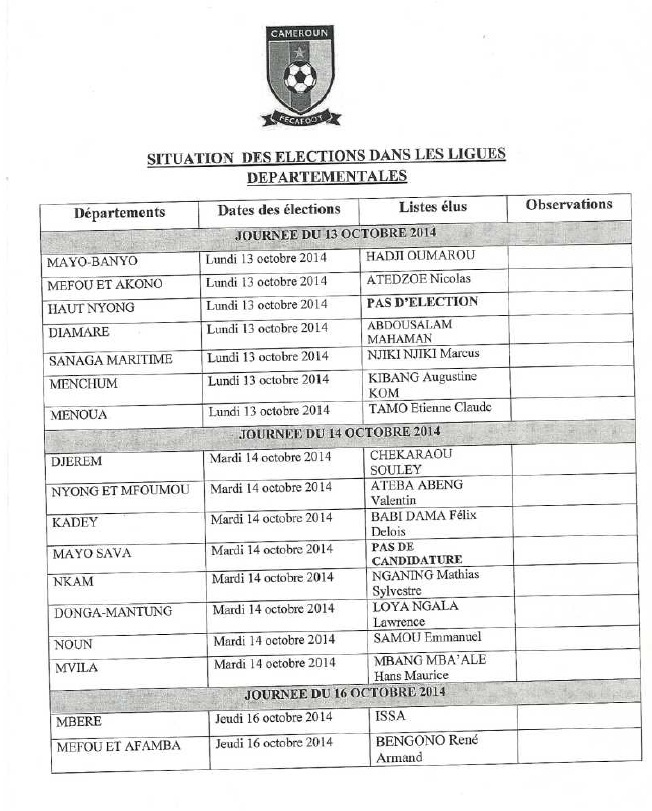 Le processus électoral à la Fécafoot a démarré le 13 octobre dernier. Et ce sont les ligues départementales qui ont ouvert le bal. Les élections au niveau régional sont prévues pour le 7 novembre, tandis que la fédérale va se tenir le 29 novembre prochain. Les premiers élus sont connus