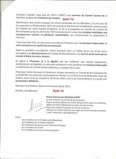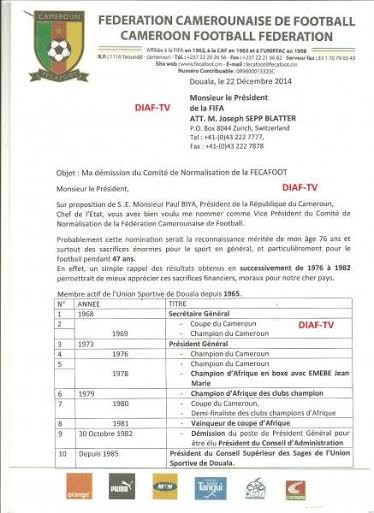 Le patriarche de l’Union prend acte de la dernière rallonge accordée au comité de normalisation le 28 novembre dernier, et se réserve le droit de faire des déclarations dans la presse, quelle qu’elle soit, avant au moins à la fin du bail de ce comité le 28 février prochain. «Parce que j’aime mon pays le Cameroun, et pour permettre au Comité de Normalisation de la Fécafoot de continuer sereinement sa mission, je ne ferai aucune déclaration dans les médias, avant la fin du mandat le 28 février 2015, sauf si par extraordinaire, il y aurait une provocation délibérée», ajoute-t-il.