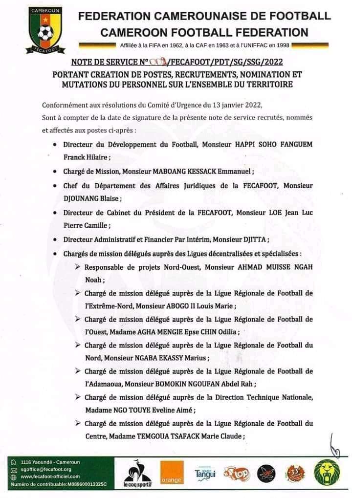 Notons que de nombreuses nominations ont en effet été effectuées par le président de la Fécafoot, à l’issue d’une session du Comité d’urgence tenue le 13 janvier dernier.
