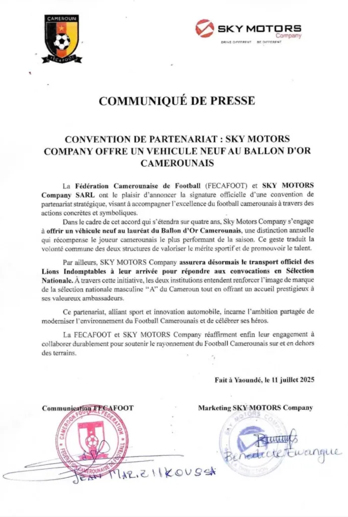 On n’en sait un peu plus sur la convention qui lie la FECAFOOT à Sky Motors. Les deux structures ont décidé de faire chemin ensemble pour les quatre prochaines années. C’est la durée de l’accord signé ce jeudi 10 juillet 2025 au siège de la Fédération à Tsinga. En effet, les détails de cette convention viennent d’être publiées par la Fédération camerounaise de football (FECAFOOT). Comme indiqué plus haut, les parties se sont accordées pour les quatre années à venir. Pas que.