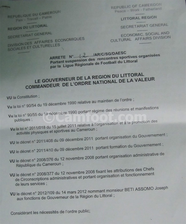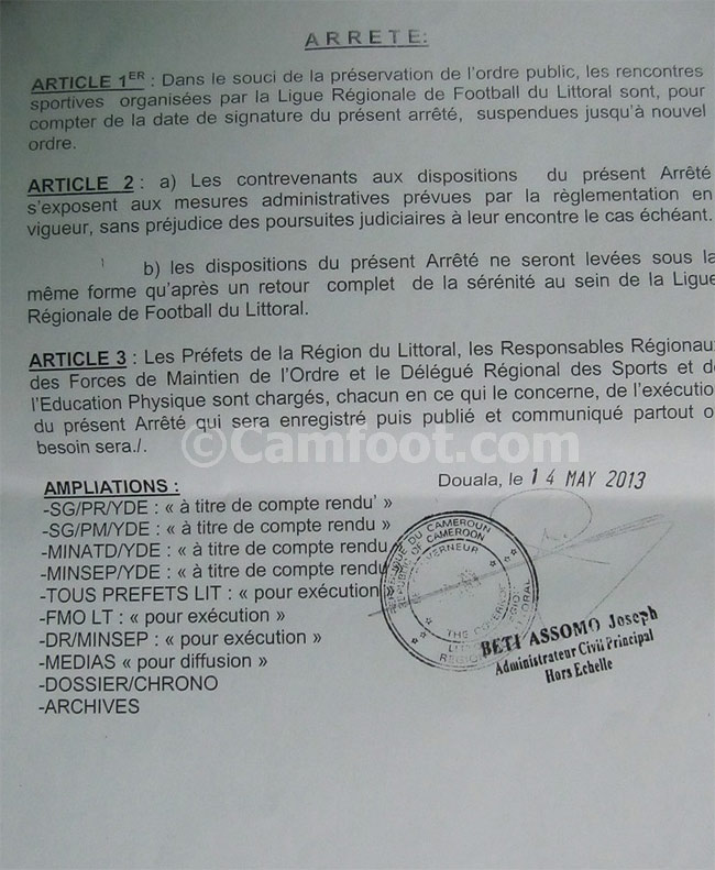 Le gouverneur de la région du littoral, Joseph Beti Assomo, dans un communiqué signé mardi 14 mai 2013 a suspendu toutes les rencontres sportives organisées par la ligue régionale de football du Littoral. Les contrevenants à cette décision s’exposeront aux dispositions administratives, prévues par la réglementation en vigueur.